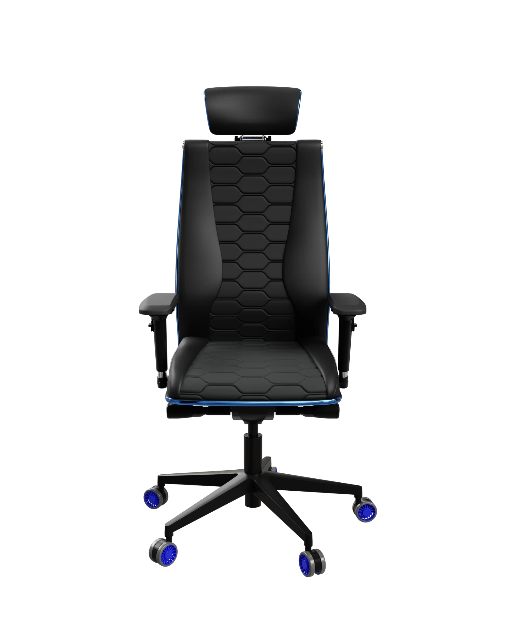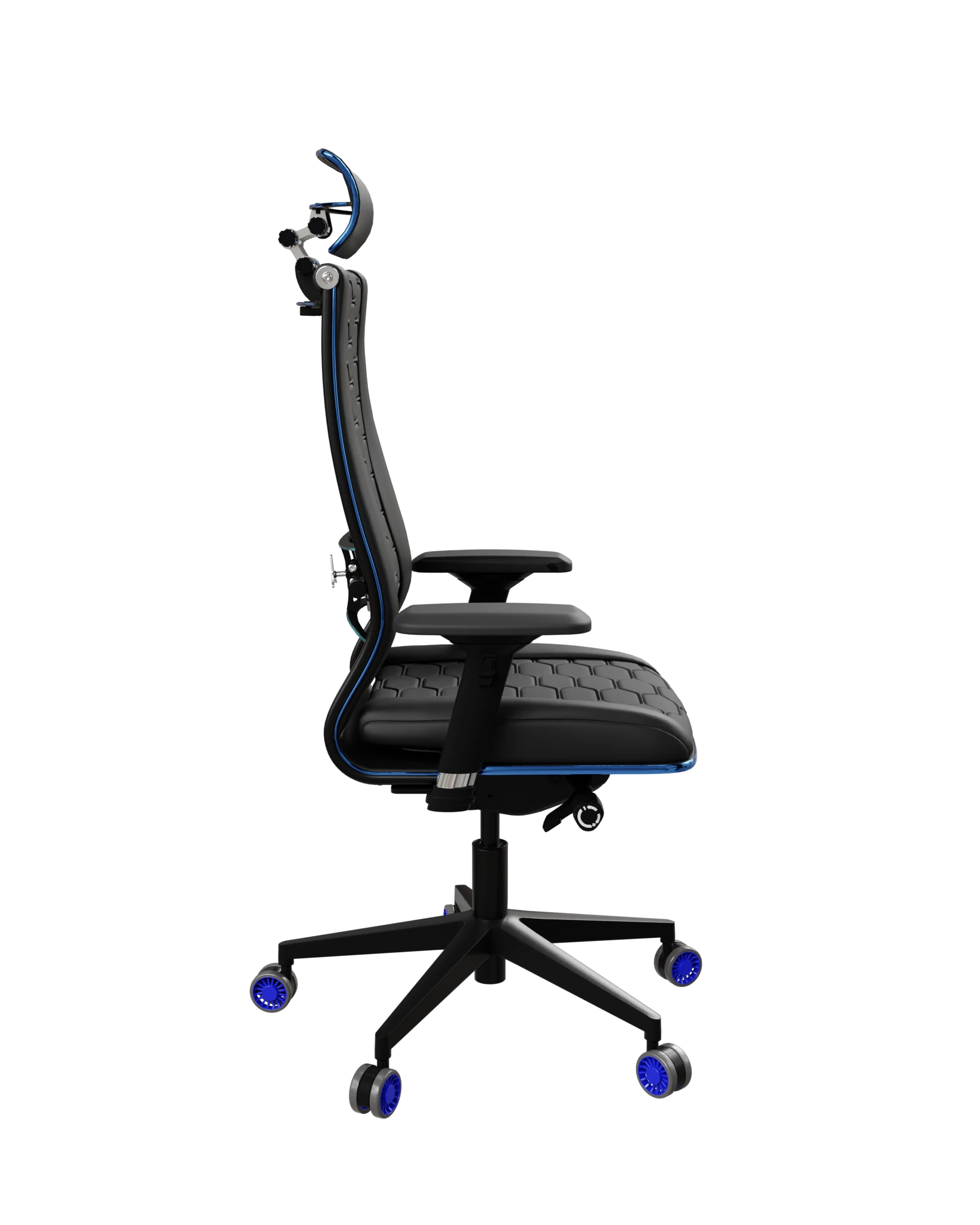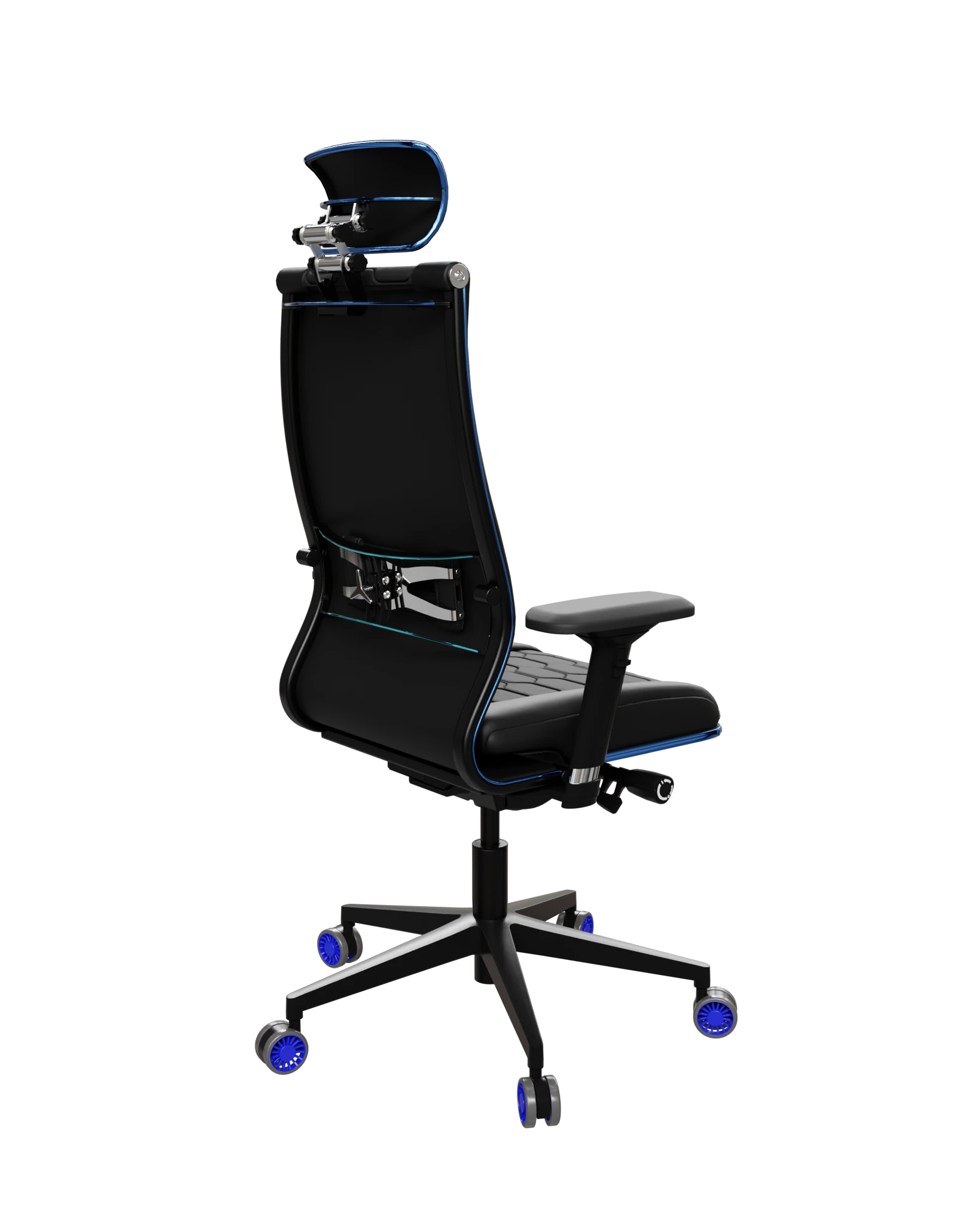 Space Blue — игровое кресло Samurai с синими молдингами и акцентами. Комбинированная обивка экокожи и сетки, 4D-подлокотники, усиленный газлифт 120/100, 3D-подголовник, специальные ролики с синим ободком.